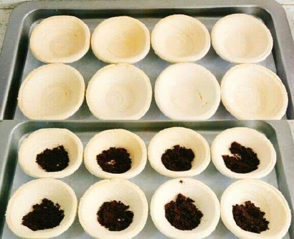 4、過濾三遍,使其蛋羹口感吃起來更嫩滑。蛋撻皮擺好,在底部加點奧利奧碎碎。